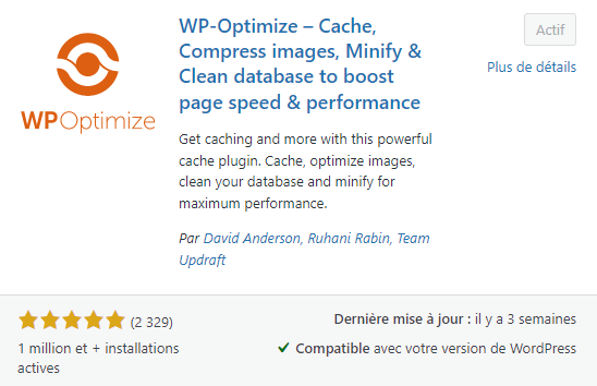 WP Optimize (gratuit) → permet d’optimiser le site mais aussi la BDD