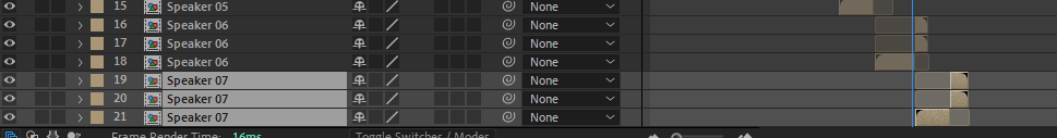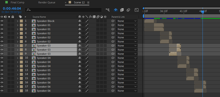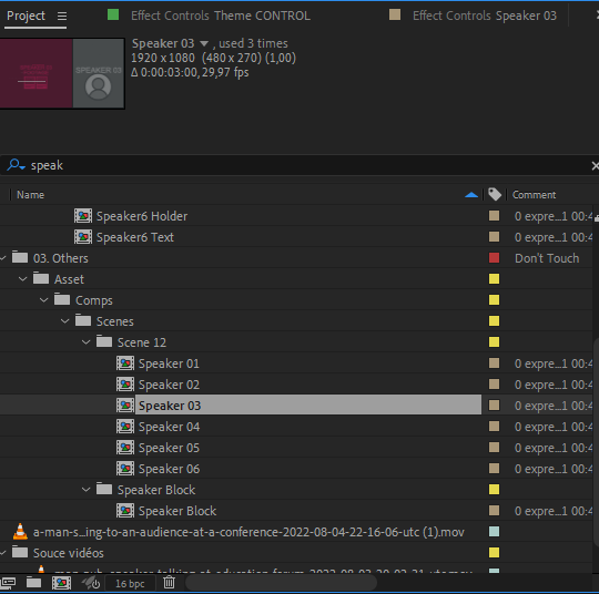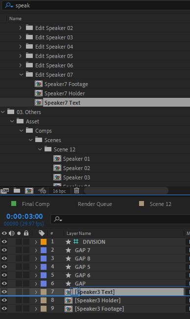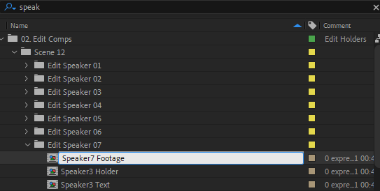 J’ouvre la composition Speaker 7 et bien sur, il contient des sous compositions du Speaker 3. Je les remplace → Sélection de la sousComp à remplacer (ici Speaker3 Text) → Dans l’onglet projet je glisse dépose Speaker7 Text vers Speaker3 Text, TOUT EN appuyant sur ALT.