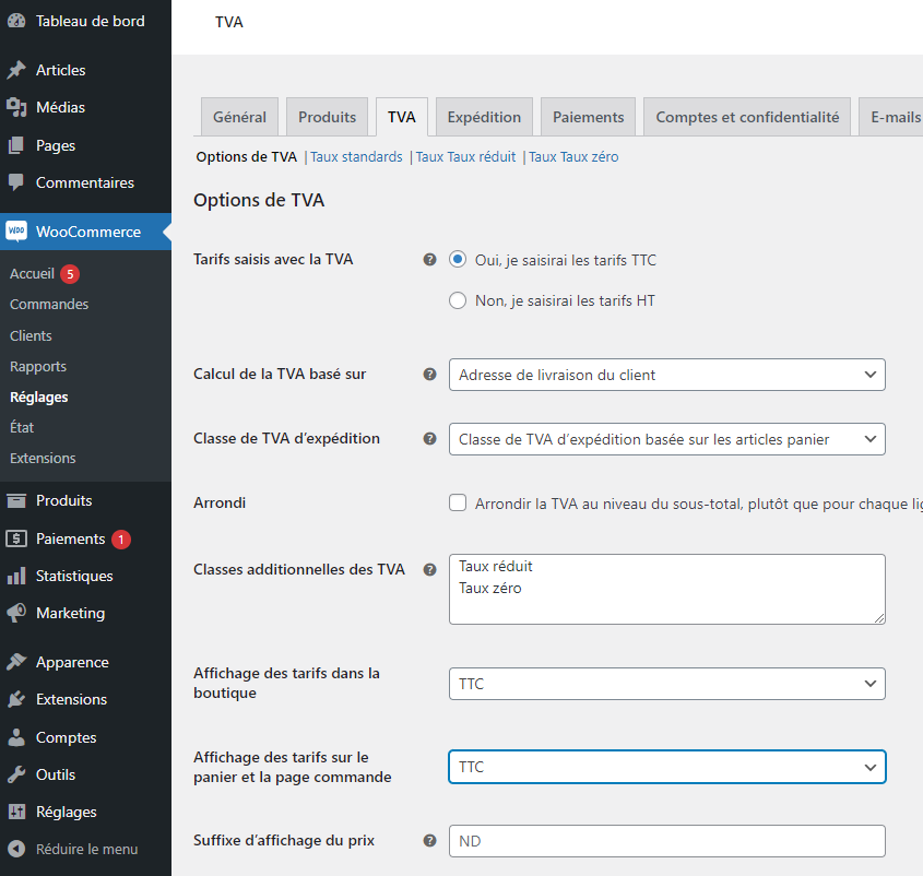 Maintenant on va régler la TVA : on coche « Oui, je saisirai les tarifs TTC », et donc on mofifi le reste des réglage en TTC (comme dans l’exemple). → On sauvegade