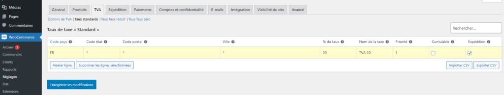 Clic sur Taux standard → « insérer une ligne » → faire les réglages