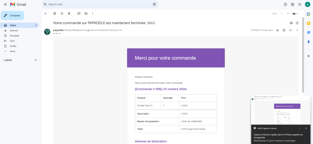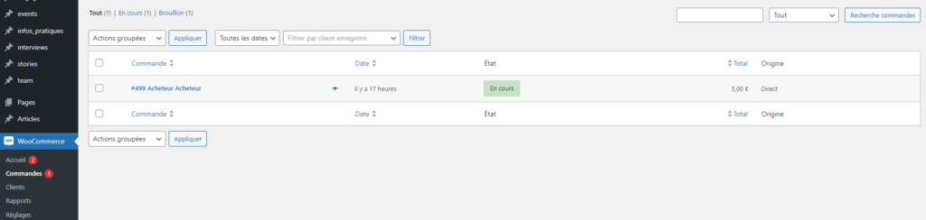 NOTE : pour vérifier la commande, on peut aller dans commende dans le back office du site et se connecter à l’adresse mail de l’acheteur (en nav privée).