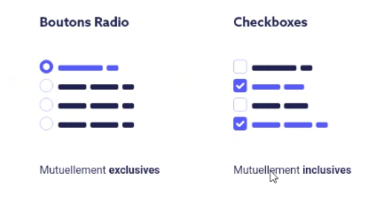 UN BOUTON RADIO : les boutons radio sont rond, c’est un choix unique. Les cases à cocher il peut y avoir plusieurs choix, ça veux dire que si on veut on peut tous les cocher C’est une norme.