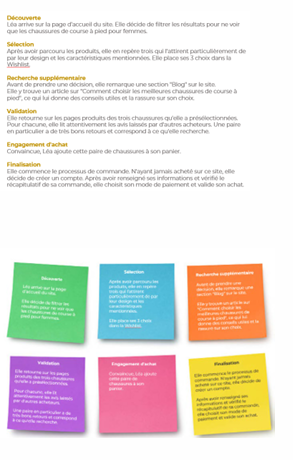 Mise en forme : On organise l’user scénario en étapes. C’est étapes peuvent ensuite être mises en formes (ci-après une présentation en post-it. ATTENTION : Il est d’usage de toujours joindre le persona au scénario.