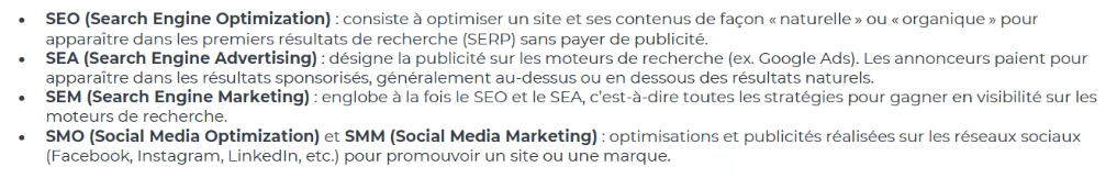 - déjà il faut faire compredre au client qu’il y a 4 types de référencement SEO, SEA, SEM, SMO