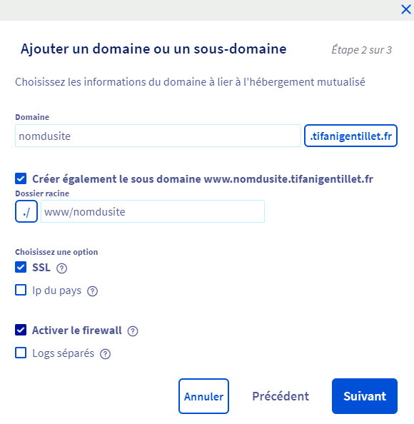 Là, je me rends dans la section “Multicite” et j’ajoute un sous-domaine en complétant les informations nécessaires : l’adresse de la redirection et le chemin d’accès au répertoire FTP de mon site.