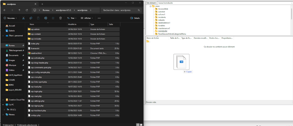 Je télécharge ensuite la dernière version de WordPress depuis le site officiel wordpress.org. Une fois téléchargé, il ne reste plus qu’à décompresser l’archive wordpress et transférer, par un glisser-déposer, tous les fichiers dans mon FTP.