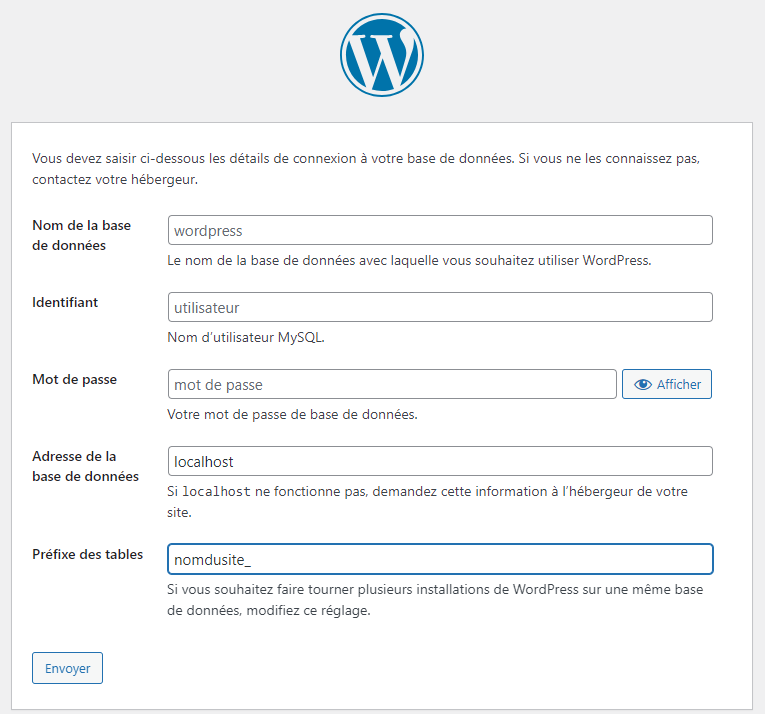 Je commence par connecter ma base de données en entrant toutes les informations nécessaires. Comme je travaille avec des sous-domaines dans une même base donnée, je fais bien attention à changer le préfixe des tables, pour éviter d’écraser la base données d’un autre site.