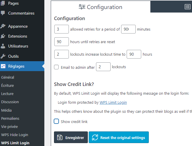 - “WPS Limit Login”, pour limiter le nombre de tentatives de connexion au backoffice du site. Dans les réglages, j’augmente les temps de blocage pour dissuader les tentatives d’intrusion. Je décoche également « Show credit link » pour minimiser les informations visibles sur la protection du site.