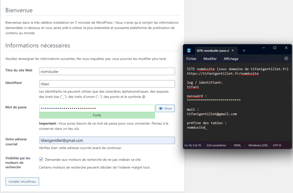 Ensuite, je renseigne les informations de mon site, crée mon compte administrateur et coche la case pour empêcher le référencement du site par les moteurs de recherche. Je note mes codes en lieu sûr, puis je valide.